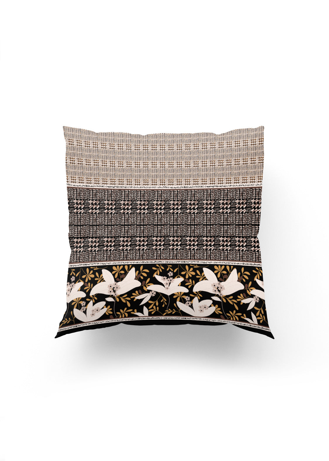 Etnik ve Çiçek Desenlerin Büyüsü – Bej, Siyah ve Altın Tonlarında Lüks Kırlent Kılıfı
